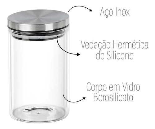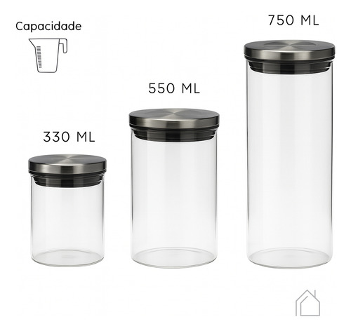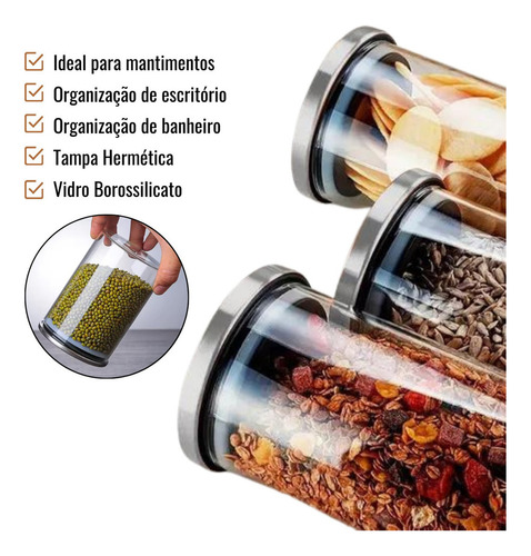 Potes Hermético Vidro Tampa Inox Kit 3 Unidades Mantimentos